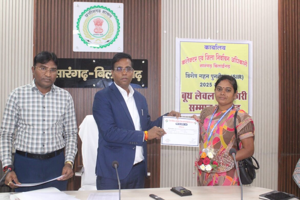 सारंगढ़-बिलाईगढ़ (सृजन न्यूज)। कलेक्टर डॉ. संजय कन्नौजे ने सारंगढ़-बिलाईगढ़ जिले के विधानसभा 17 सारंगढ़ में 100 प्रतिशत एसआईआर कार्य को पूर्ण करने वाली मथुरा पटेल को कलेक्टोरेट सभाकक्ष में सम्मानित किया।