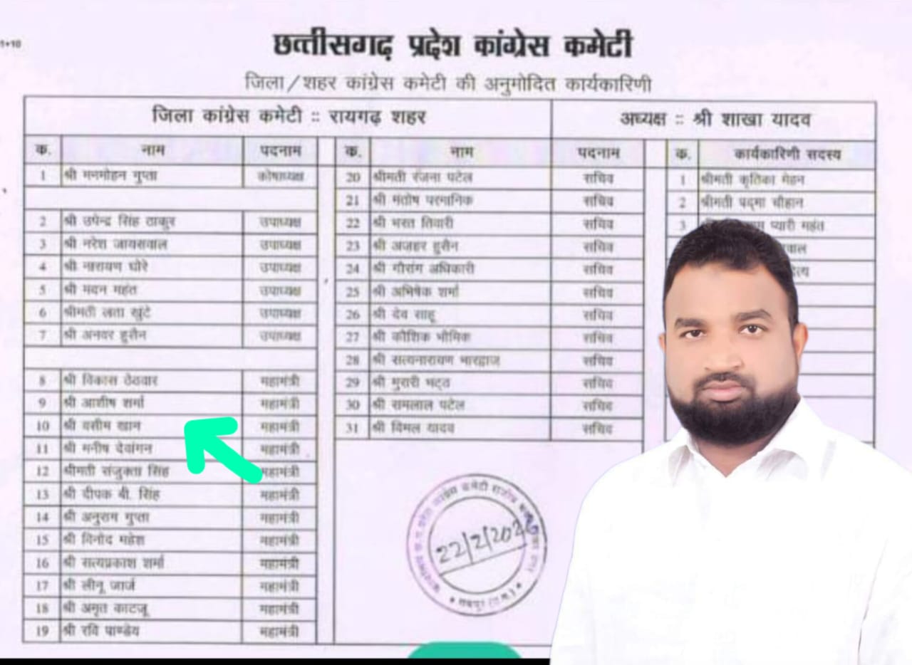 रायगढ़ (सृजन न्यूज)। छत्तीसगढ़ प्रदेश कांग्रेस कमेटी द्वारा रायगढ़ शहर जिला कांग्रेस कमेटी के नए पदाधिकारियों की बहुप्रतीक्षित सूची जारी कर दी गई है। छत्तीसगढ़ प्रदेश कांग्रेस कमेटी के निर्देश पर जारी इस सूची में 31 नेताओं को संगठन की अहम जिम्मेदारियां सौंपी गई हैं। इसी क्रम में कांग्रेस के सक्रिय और कर्मठ नेता वसीम खान को शहर जिला कांग्रेस कमेटी का महामंत्री नियुक्त किया गया है। उनकी नियुक्ति से संगठन में नई ऊर्जा और जोश का संचार देखा जा रहा है।