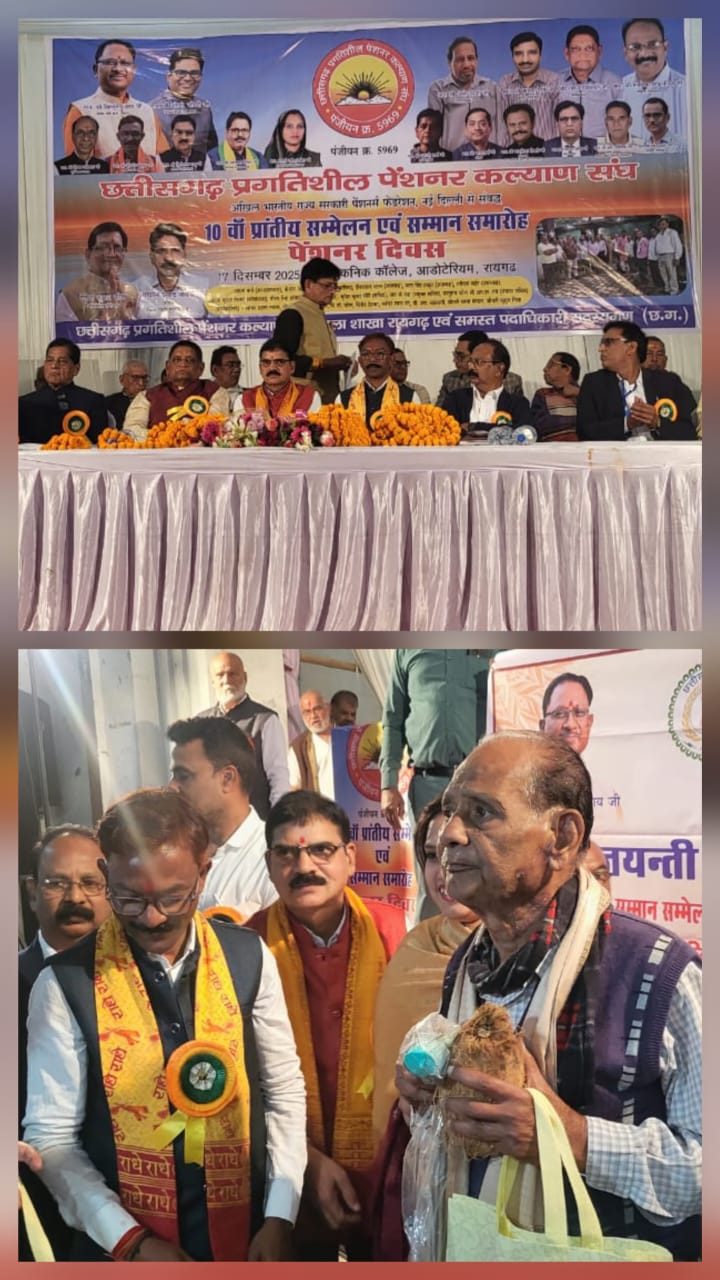 छत्तीसगढ़ प्रगतिशिल पेशनर कल्याण संघ प्रान्तीय निकाय के द्वारा गत 17 दिसम्बर को राष्ट्रीय पेशनर दिवस के अवसर पर संघ का 10 वां प्रान्तीय सम्मेलन और सम्मान समारोह में प्रदेश से काफी संख्या में पेशनर्स ने शिरकत किया। संगठनात्मक सत्र का शुभारंभ अखिल भारतीय राज्य सरकारी पेंशनर्स फेडरेशन के राष्ट्रीय उपाध्यक्ष सालिक माऊलीकर, प्रान्त अध्यक्ष आरके थवाईत, देवेन्द्र पटेल के द्वारा संघ का ध्वजारोहण और रायगढ़ के कर्नल विप्लव त्रिपाठी, दिवंगत कर्मचारी नेता स्व. एएस जुलु, राजीव रत्न चौबे, एसपी सिंह को श्रद्धांजलि देते हुए किया गया। संगठनात्मक सत्र को संबोधित करते हुये राष्ट्रीय उपाध्यक्ष सालिक माऊलीकर ने कहा कि छत्तीसगढ़ के पेशनर्स के राष्ट्रीय स्तर की समस्याओं को केन्द्र सरकार तक पहुंचाने और उसका निराकरण अखिल भारतीय राज्य पेंशनर्स फेडरेशन राष्ट्रीय स्तर में रखेगा। प्रगतिशील पेशनर कल्याण संघ के पदाधिकारी नए सदस्यों को जोड़ते हुए संगठन को मजबूती प्रदान करें।