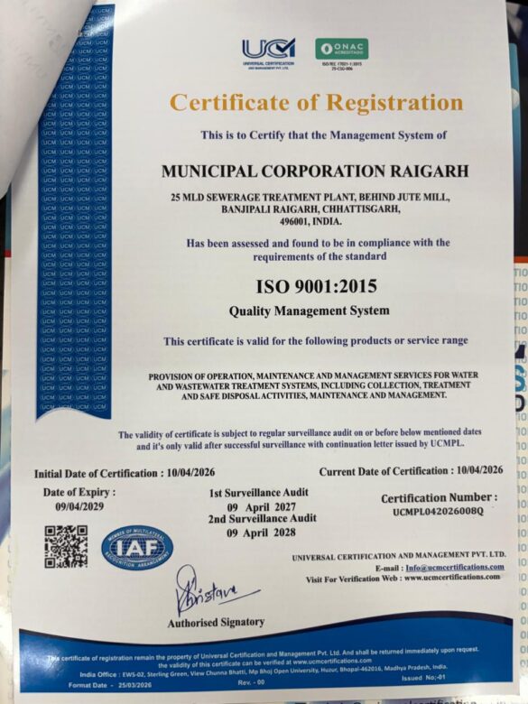 रायगढ़ (सृजन न्यूज)। नगर निगम रायगढ़ के लिए यह गौरव का विषय है कि शहर के 25 एमएलडी एवं 7 एमएलडी सीवरेज ट्रीटमेंट प्लांट (एसटीपी) को अंतरराष्ट्रीय स्तर का ISO 9001:2015 (क्वालिटी मैनेजमेंट सिस्टम) प्रमाण पत्र प्राप्त हुआ है। इसके साथ ही रायगढ़ नगर निगम के दोनों एसटीपी के नाम प्रदेश का पहला आईएसओ प्रमाणीकरण का ताज सज गया है। यह उपलब्धि निगम आयुक्त बृजेश सिंह क्षत्रिय के कुशल मार्गदर्शन, सतत निगरानी एवं टीम के समर्पित प्रयासों का परिणाम है।